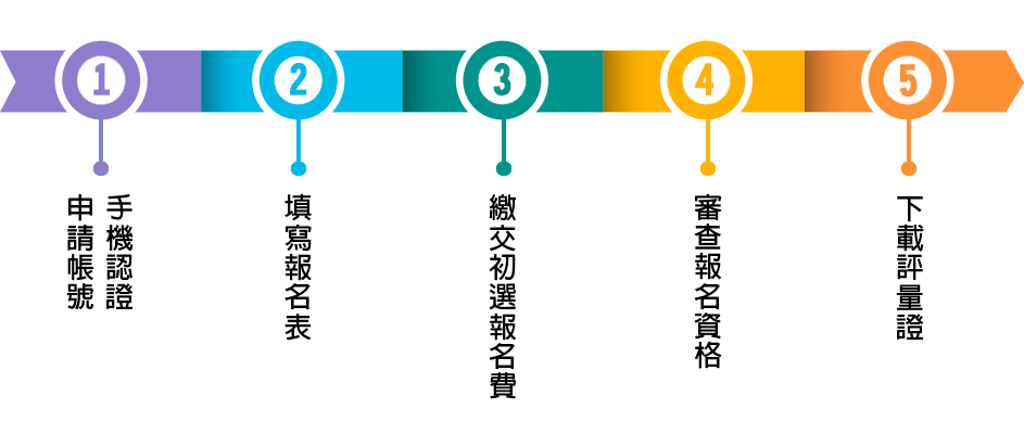 報名申請流程 報名申請說明: 第一次進入報名系統者,請先申請新帳號(帳號為手機號碼)。手機號碼申請將會收到6碼數字。請至您(手機認證)進行帳號認證動作。 帳號認證通過者,即可登入填寫報名表。填寫完畢後,依照簡章內時程印出繳費單進行繳費。(經確認繳費無誤後,將會收到繳費成功簡訊通知)。若有申請免繳報名費者,可先不需繳交報名費,等待資格審查。 資格審查通過者,請依照簡章內時程印出鑑定評量證。